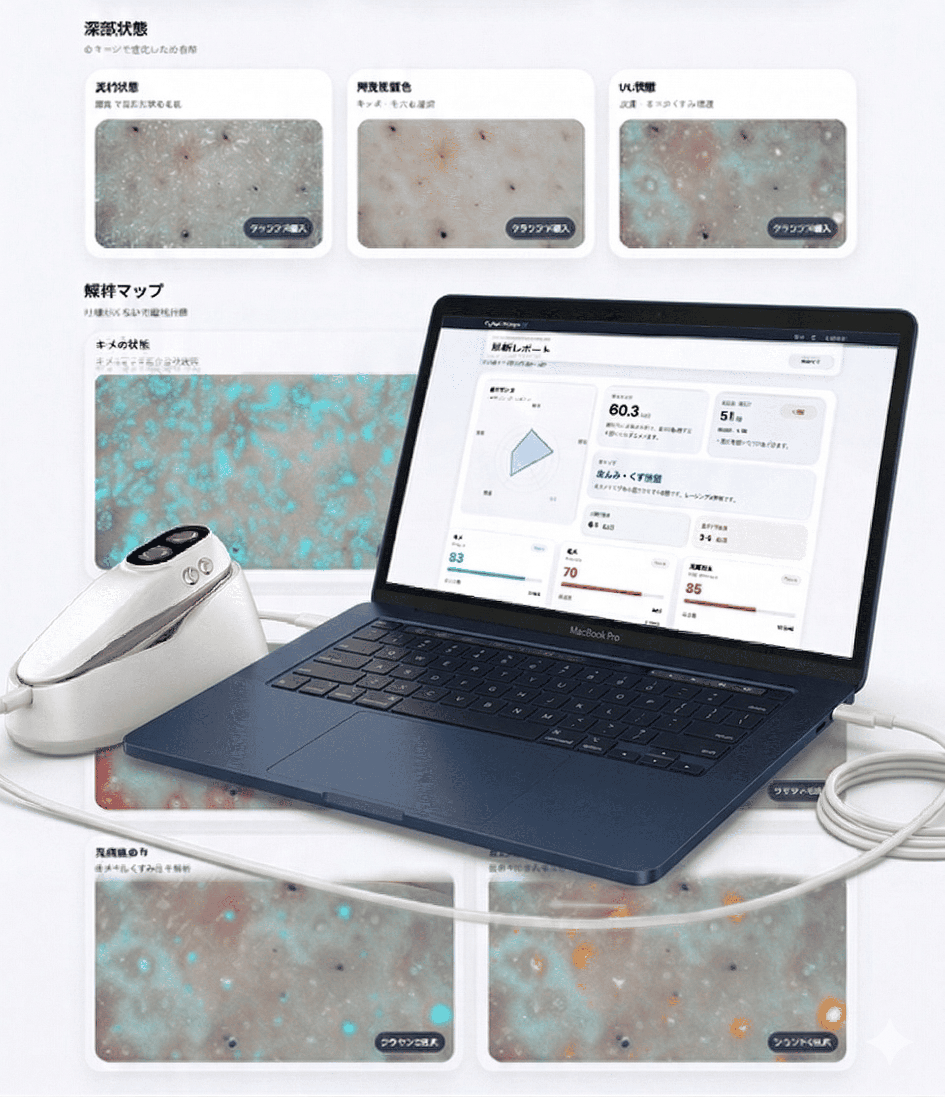 サイバースコープAIは、50倍マイクロスコープ(3光源)とMacBook Airを組み合わせた、 肌状態の可視化・解析・表示を一体化したシステムです。